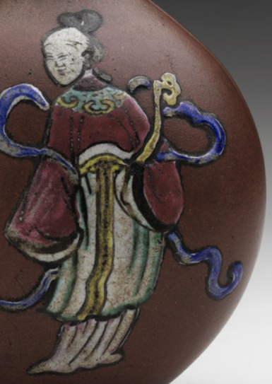 本品规格为5.72 x 4.45 x 3.81 厘米。以深褐紫砂为胎,呈扁圆造型。壶身绘加彩人物,身着红衣绿裳,衣带飘飞,手持如意,旁饰黄月,色彩对比鲜明。彩绘工艺让人物形象鲜活,融合紫砂质朴与彩饰灵动,是兼具实用与艺术价值的鼻烟壶,尽显传统工艺韵味 。