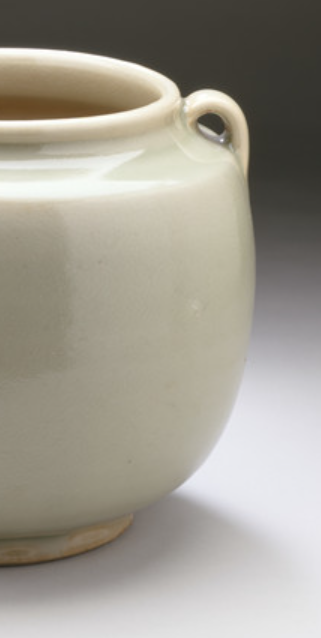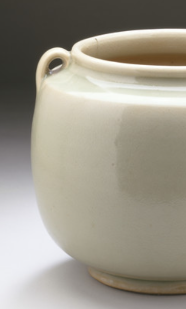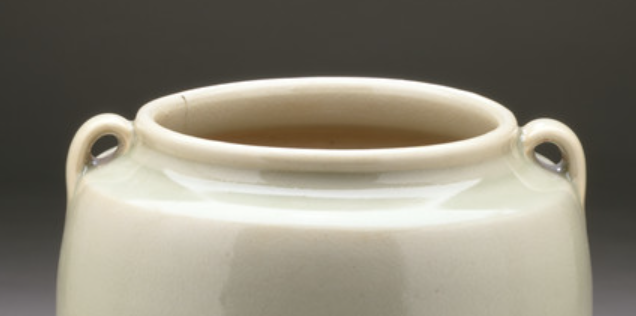 本品高度为14.6厘米,直径17.14厘米。敛口、鼓腹、双系耳,器型饱满实用, 施白釉。