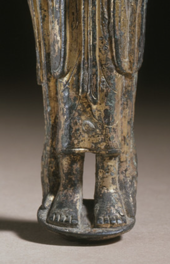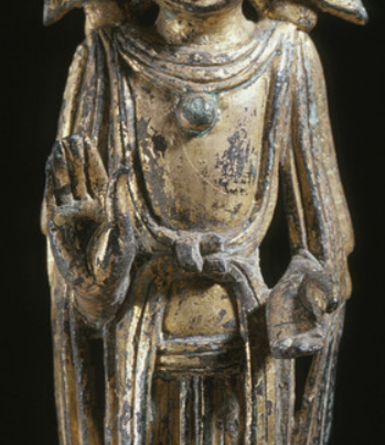 本品规格为16.51 x 3.81 x 3.81 厘米。 菩萨头戴宝冠(顶部有化佛或宝瓶等元素,体现身份 ),冠侧出花蔓状装饰;面型圆润,神态慈悲宁静;身着天衣(轻薄长袍 ),衣纹流畅贴体,腰间束带,佩饰简洁;右手施无畏印(象征解除众生恐惧 ),左手持净瓶(或象征慈悲与甘露 ),双脚立于莲台(虽残损仍可辨形制 ),整体姿态端庄,符合隋代菩萨造像 “秀骨清像向圆润饱满过渡” 的风格。