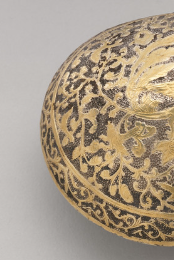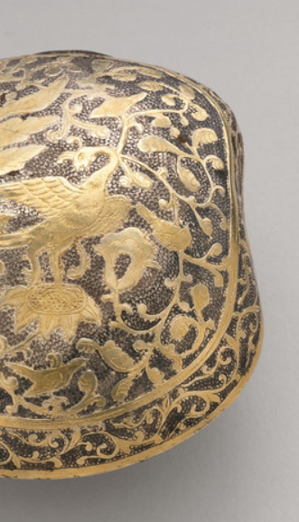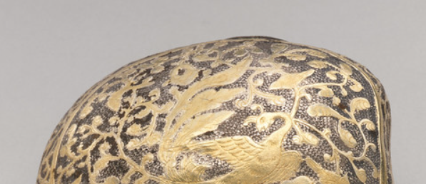 本品规格为3.81 x 7.93 x 7.62 厘米。整体呈不规则圆形。银质基底,表面鎏金,以錾刻工艺呈现精美花纹:主体有禽鸟(如孔雀 ),周围环绕缠枝花卉,构图繁缛华丽。