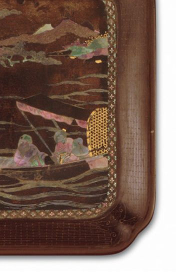 本品规格为1.27 x 11.75 x 11.75 厘米。以漆器为胎(棕红色漆底 ),采用螺钿镶嵌工艺(彩贝薄片拼贴 ),将人物、山水、舟船等图案嵌入漆层,利用螺钿的天然光泽(五彩斑斓 ),呈现丰富视觉效果;边缘辅以细线刻纹(网格、花卉等 ),强化装饰层次。