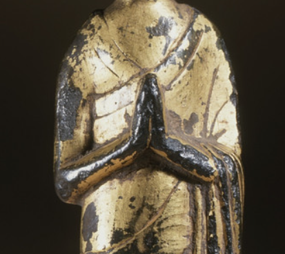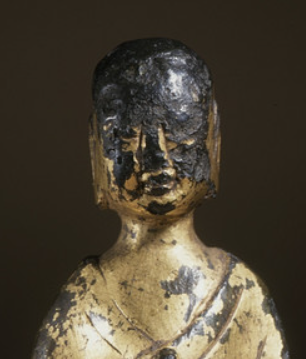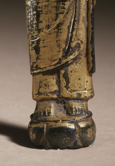 本品高度为10.16厘米。以铜为胎,表面鎏金,因岁月侵蚀,鎏金斑驳脱落,显古朴沧桑。佛像呈站立姿,身着袈裟,衣纹简洁流畅,双手合十于胸前,结跏趺坐于莲台。
