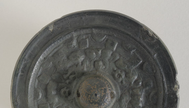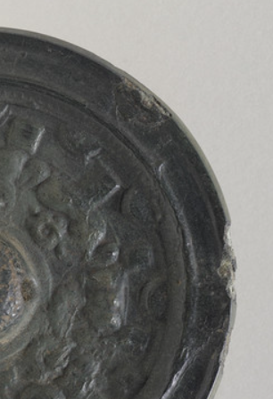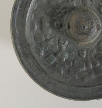 本品规格为1.27 x 12.07 厘米。 圆形,中间有半球形钮,是南北朝铜镜常见的造型,简洁而规整。镜背主体为神兽纹,神兽形态稚拙、线条粗犷,虽不及唐代铜镜细腻,但生动展现了南北朝艺术的豪放风格,神兽间布局紧凑,带有浓郁的宗教与祥瑞寓意,反映当时人们对神兽辟邪祈福的寄托。