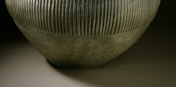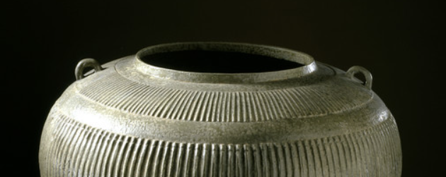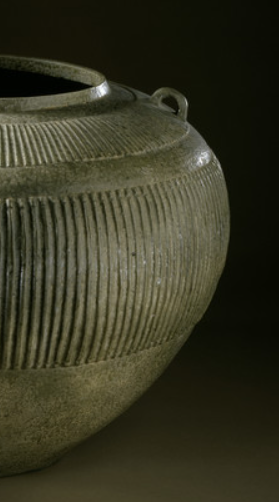 本品规格为33.02 x 35.56 厘米。其造型为圆腹、敛口,肩部有对称双系。罐体施青釉,饰弦纹(多道凸起线条 ),呈现古朴质感。作为战国时期的青瓷,反映当时制瓷工艺水平, 是研究古代陶瓷发展、战国生活用器的重要实物, 见证早期瓷器从原始向成熟演进的阶段 。