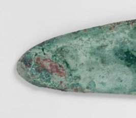 本品规格为21.27 x 7.94 x 7.94 厘米。整体呈现出古朴厚重的质感,表面因岁月侵蚀覆盖着斑驳的绿锈与红斑,是铜锈自然氧化的痕迹,见证漫长历史。其形制上,援部(戈的刃身部分)窄长且前端尖锐,利于啄击、钩割;阑部(援与内之间的凸起)有穿孔,用于穿绳绑定柲(木质戈柄 ),以固定戈身;内部(戈尾部分)带有装饰性纹饰或铭文。