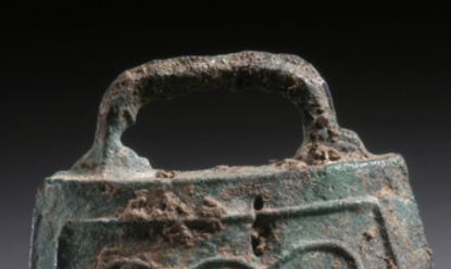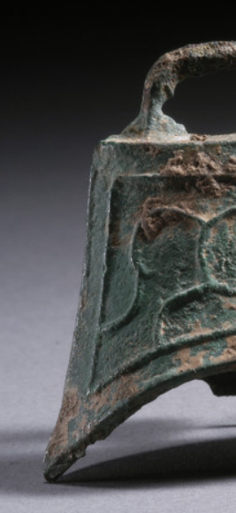 本品规格为4.13 x 4.13 x 2.22 厘米。其造型为合瓦形,有环形纽,器身饰有简化纹饰,虽历经岁月侵蚀,仍可见古朴质感。商代青铜铃常用于祭祀、礼仪等活动,是研究商代礼乐文化与青铜工艺的重要实物,见证当时的社会风貌与技术水平 。
