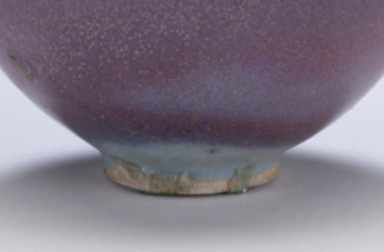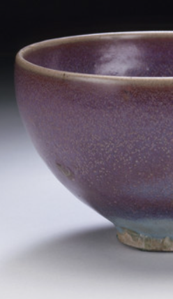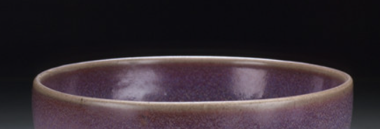 本品高度为7.9厘米,直径危14厘米。碗身施玫瑰紫釉,紫蓝交融间泛金色窑变斑点,因钧窑独特的 “铜红釉” 配方与还原焰烧制,自然形成 “入窑一色,出窑万彩” 的奇幻效果,是宋代 “尚变” 审美在陶瓷中的体现。