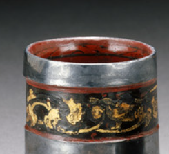 本品规格为盒子6.2*4.13厘米,盖子5.72*4.77厘米。由两件漆奁组成,以漆为胎,饰银质扣边。奁身髹黑红漆,以金彩绘纹饰,图案或为云气、神兽等。造型呈圆筒状,有盖与无盖之分,银扣加固且具装饰性。