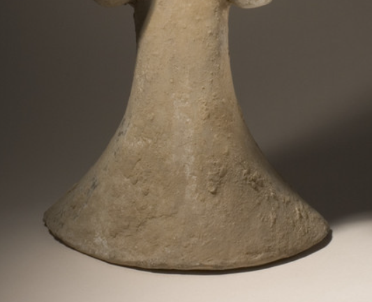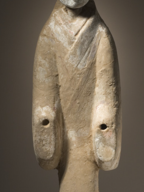 本品规格为头部10.8*12.07*8.26厘米,主体64.14*26.67*14.61厘米,整体65.41*26.67*17.78厘米。女俑呈站立姿态,头部梳有汉代典型发髻,面部轮廓虽因岁月侵蚀略显斑驳,但仍可辨五官形态。身着交领右衽长袍,衣袖宽大,双手拢于袖中,衣袖处有孔洞。