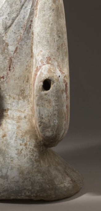 本品规格为头部11.43*10.8*8.89厘米,主体46.99*24.77*13.97厘米,整体50.8*24.77*13.97厘米。陶质为胎,表面施有彩绘(虽历经岁月,部分色彩有剥落,但仍留存红色等彩绘痕迹 )。女俑为立姿,头部梳有汉代风格发髻,面部五官虽有风化但轮廓可辨。身着汉服,交领右衽,衣袖宽大,双手拢于袖中,衣袖处有孔洞,整体造型古朴端庄。