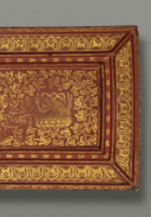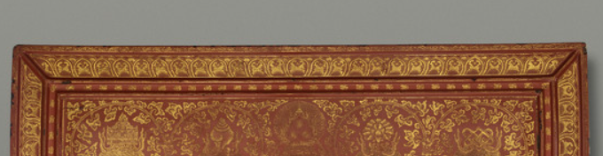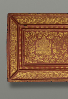 本品规格为3.2 x 73 x 27 厘米。以木材为胎,通体髹红漆作底,表面以金漆细腻描绘纹饰。长方形形制,边缘饰连续卷草等纹样,规整华丽;中间主体区域呈现佛塔、佛像、花卉等佛供题材图案,线条流畅,金色与红漆对比鲜明。