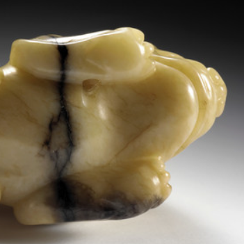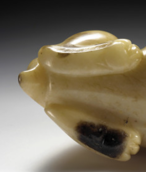 本品规格为2.86 x 2.86 x 6.35 厘米。以温润玉石雕琢而成,整体呈卧兽形态。兽身线条流畅,虽经岁月仍可见古朴质感,部分区域带有深色纹理,增添自然韵味。造型憨态可掬,体现明代玉雕写实与简约风格融合的特点。