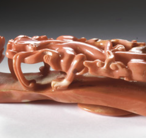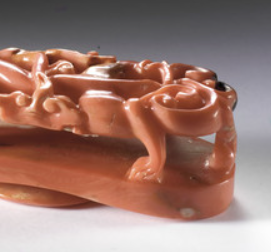 清代,珊瑚作为珍贵的有机宝石,其采集主要依赖于海洋捕捞。当时的渔民逐渐掌握了在特定海域采集珊瑚的方法 ,尽管采集过程充满艰险,但仍能获取一定数量的珊瑚原料。在加工方面,工匠们借鉴了玉石、象牙等雕刻工艺, 运用锯、凿、刻、磨等多种技法,针对珊瑚相对较脆的特性,小心翼翼地雕琢。 对于珊瑚苍龙教子带钩,工匠要巧妙设计, 依据珊瑚的形状和纹理,将苍龙与幼龙的形态生动展现, 这对雕刻技艺要求极高 。