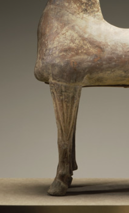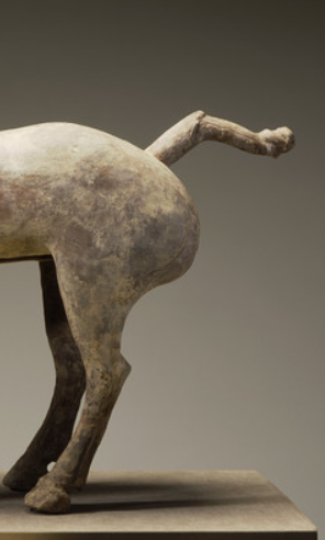 本品规格为59.69 x 54.61 x 16.51 厘米。以陶土为原料烧制。整体造型矫健,昂首竖耳,马头轮廓线条硬朗,张嘴似作嘶鸣状。马身肌肉线条虽因岁月有磨损,但仍可辨劲健体态,四肢修长且比例协调,尾巴上扬卷曲。陶俑表面存斑驳痕迹,保留西汉陶塑古朴质感。