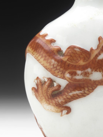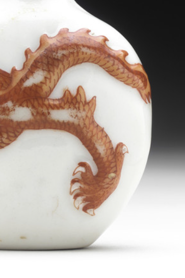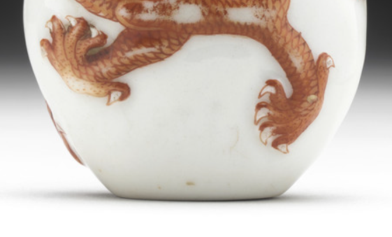 本品规格为5.72 x 5.08 x 3.18 厘米5.72 x 5.08 x 3.18 厘米。呈扁圆壶形,小口、短颈、鼓腹,线条简洁流畅,符合鼻烟壶便于手持、携带的实用造型需求,小巧精致,尽显典雅规整 。以白色瓷胎为地,腹部绘矾红彩龙纹。龙纹形态矫健,龙身蜿蜒、龙爪刚劲,矾红色泽鲜艳,与白釉形成鲜明对比,生动展现传统龙纹的威严与气势,是中国传统文化中皇权、祥瑞象征的体现 。