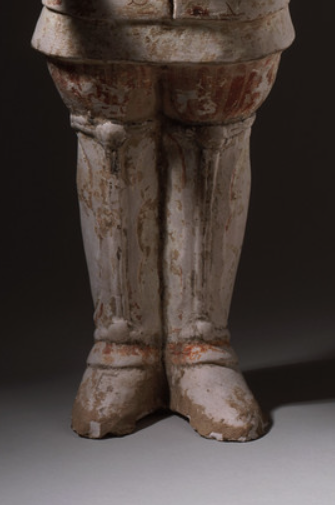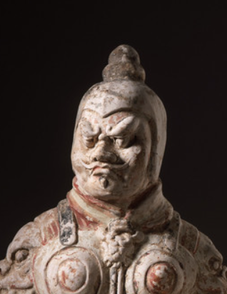 本品高度为57.47 厘米。 武士俑身姿挺拔, 头戴盔帽, 面部表情威严刚猛, 蹙眉怒目、嘴角紧抿, 传递出 “威慑八方” 的气势,身着铠甲, 甲胄细节丰富 —— 胸甲、护肩、腹甲塑造立体, 彩绘装饰虽斑驳仍可辨红、绿等色, 模拟金属铠甲的纹理与色彩, 展现唐代陶塑工匠模制、彩绘技艺的精湛, 将武士的英武之气与铠甲的厚重质感完美融合。