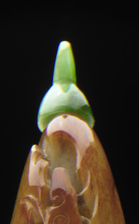本品规格为整体9.21 x 3.81 x 2.54 厘米,盖子7.94 x 3.81 x .95 厘米,瓶子7.94 x 3.81 x 2.54 厘米。选用和田玉籽料为胎,保留天然璞玉形态 —— 棕褐皮色包裹温润玉质, 色泽过渡自然,尽显 “天人合一” 的审美意趣。器型随玉料天成,呈瓜果状(似茄子 ), 小巧便携,契合鼻烟壶 “掌中雅玩” 的功能属性。
