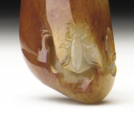 清代的艺术审美追求细腻、精致、富有情趣。和田玉温润细腻的质地, 为巧雕工艺提供了绝佳的载体。巧雕昆虫纹能够充分展现工匠的技艺, 通过巧妙利用玉料的颜色、纹理,雕刻出栩栩如生的昆虫形象, 体现了清代艺术对细节和创意的重视,符合当时社会的审美标准。