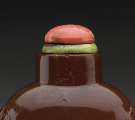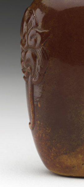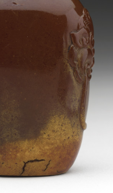 清代商品经济繁荣,城市商业活动活跃,市民阶层逐渐壮大, 人们的生活水平得到提高,消费能力也随之增强。鼻烟壶作为兼具实用和装饰功能的物品, 受到各阶层的喜爱,市场需求不断扩大。尤其是富裕阶层和文人雅士, 对鼻烟壶的材质、工艺和装饰有着更高的要求。酱釉铺首耳鼻烟壶以其古朴的釉色和独特的装饰, 迎合了部分消费者追求个性和文化内涵的需求,刺激了相关手工业的生产和发展。