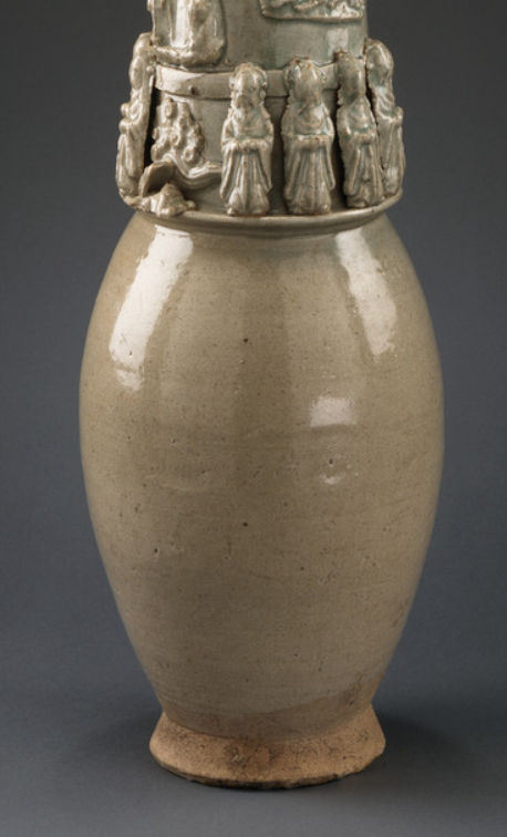 本品高度为88.9 厘米。由瓶身、堆塑层、顶盖构成, 瓶身修长,下腹鼓胀, 顶盖饰立鸟(似鹤 ), 采用青白釉 + 堆塑技法, 青白釉温润淡雅, 堆塑层满布人物、飞鸟、云纹、日月等元素 —— 人物或立或侍,神态各异; 飞鸟、云纹灵动飘逸; 日月造型点缀其间, 立体生动。