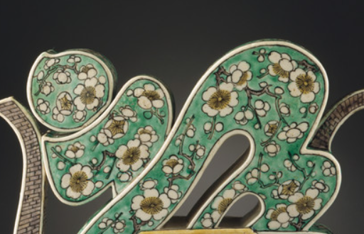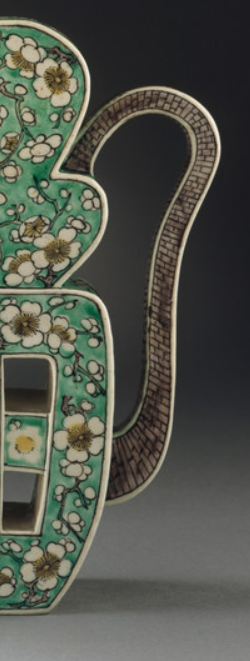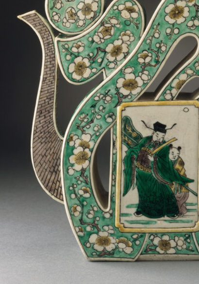 本品规格为27.94 × 22.86 × 3.81 厘米。以 “福” 字为整体造型框架,巧妙利用汉字结构,把壶流、壶柄、壶身融入笔画,构思新颖独特。“福” 字象征吉祥,既具实用功能(可盛水、倒水 ),又为文化符号载体,是清代瓷器 “器以载道” 设计理念的体现。