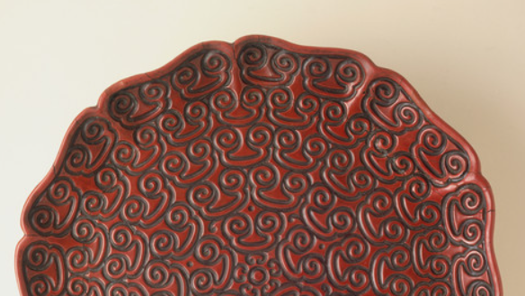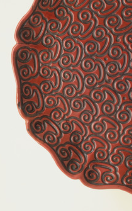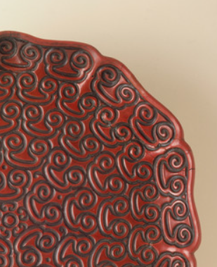本品规格为4.45 x 35.56 厘米。盘口为花口样式,边缘呈花瓣形起伏,打破圆形的单调,增添灵动美感。花口与盘身的云纹装饰相呼应,整体造型兼具实用性与艺术性。采用剔犀工艺,红、黑等色漆分层髹涂,再以刀具剔刻出云纹图案。漆层厚实,刀口清晰,纹理流转自然,呈现出独特的 “乌间朱线” 效果,是剔犀工艺 “层层相叠,刀口断面可见不同色漆” 特点的典型体现。