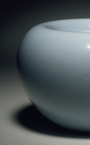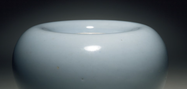 清代文人阶层对社会审美风尚有着重要的引领作用,他们崇尚文雅、精致的生活情趣,对文房用品的要求很高。 苹果尊作为文房水盂,是文人书房中的雅器,受到文人的喜爱。 其造型小巧可爱,釉色清新淡雅,符合文人的审美标准,也反映了当时文人文化对瓷器制作的影响,使得天蓝釉苹果尊不仅具有实用功能,更成为一种文化和艺术的象征。