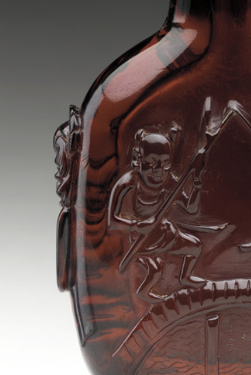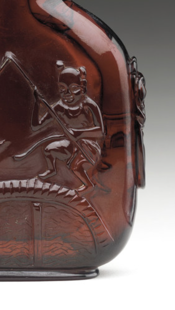 本品高度为8.3厘米,宽度为6.4厘米。呈扁瓶状,小口、束颈、鼓腹,两侧饰有对称的兽首形耳(或为铺首 ),线条流畅,符合鼻烟壶便于握持、携带的实用造型特点,小巧玲珑,尽显典雅规整 。壶身浮雕童子戏纹,两名童子姿态生动,手持器物(似渔叉等 ),蹲坐于桥上,桥下有水波纹饰,营造出活泼有趣的场景。童子形象憨态可掬,纹饰细节刻画细腻,体现清代对民俗题材、吉祥寓意的喜爱,传递出欢乐、祥和的氛围 。
