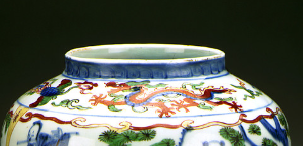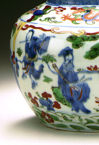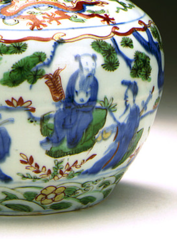 明代商品经济活跃,市民阶层逐渐壮大,对生活品质和文化娱乐的需求增加。 瓷器不仅是实用品,也成为重要的陈设和收藏物品。五彩八仙人物纹罐以其丰富的色彩、吉祥的寓意, 受到市民阶层的喜爱,市场需求的扩大刺激了民窑的生产,使得这类瓷器得以大量烧制并在民间广泛流通。