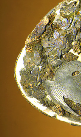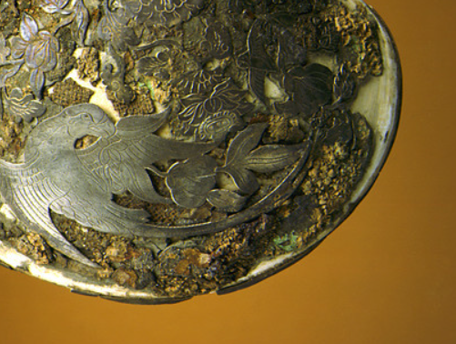 本品规格为7.94 x 9.21 x 2.86 厘米。银饰采用錾花技法,工匠以錾刀精细敲击,在金属表面刻出花卉、禽鸟图案。 花朵纹理清晰(如花瓣层次、花蕊细节 ),禽鸟形态生动(羽翅纹理、姿态鲜活 ),錾痕深浅有致, 展现唐代金银器錾刻 “细腻写实、富有生机” 的工艺水准,鎏金虽有剥落,仍可窥见原初华丽光泽。