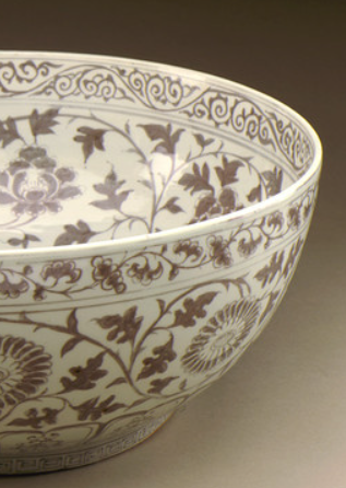 明代商品经济繁荣,城市发展迅速, 市民阶层不断壮大,对生活品质有了更高的追求。 瓷器作为兼具实用和装饰功能的物品, 市场需求日益增加。 富裕阶层和文人雅士对精美瓷器的收藏和使用需求, 推动了瓷器制作在工艺和装饰上不断创新。 釉里红缠枝花卉纹大碗以其独特的工艺和美观的装饰, 受到了市场的青睐。