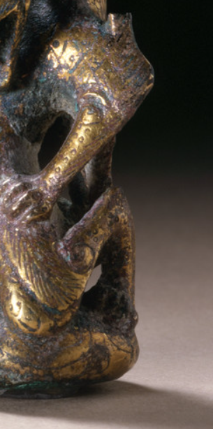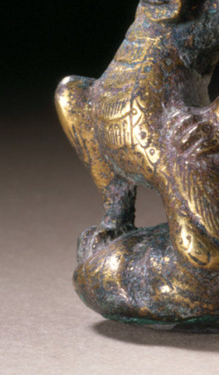 本品规格为5.08 x 2.54 x 2.54 厘米。以青铜为胎,表面错金施纹。神兽造型奇崛,昂首蹲踞,身形扭曲,羽翼、躯体满布精细错金银纹饰,虽历经岁月有锈蚀,仍显工艺精湛。其融合南北朝多元文化,是研究当时青铜工艺、宗教神话及艺术风格的重要实物,见证了南北朝时期艺术创作的想象力与工艺水平 。