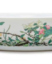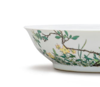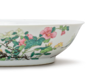 本品直径为17.78 厘米,胎质细腻,造型规整,敞口、弧壁、圈足。碗身以白瓷为地,施绘粉彩花卉图案,色彩丰富柔和,有粉、黄、绿等色,绘有花朵、枝叶,花朵形态逼真,枝叶脉络清晰,布局疏密得当,尽显自然生机。