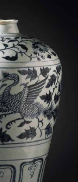 本品直径为30.48 厘米,高度为46.36厘米。造型为典型梅瓶样式,小口短颈、丰肩敛腹,古朴端庄。通体施白釉,以青花绘饰,颈部饰缠枝花卉,腹部主体绘凤凰穿行于繁茂花卉间,凤凰姿态矫健,羽翼、羽毛细节清晰,花卉枝叶舒展,青花发色浓淡相宜,层次分明。下腹饰变形莲瓣纹,增添装饰韵律。