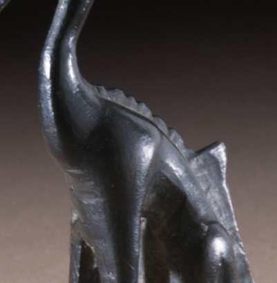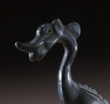 本品规格为4.76 x 2.22 x 1.27 厘米。以青铜铸就,通体呈深沉色泽,经岁月沉淀尽显古朴质感。造型为神兽,长颈弯曲,头部独特,眼、喙等细节生动,身体线条简洁流畅,尾部与四肢形态别致,整体风格神秘奇幻。