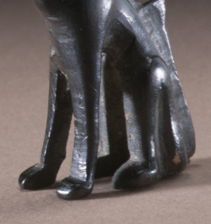 唐代是一个宗教多元发展的时代,佛教、道教盛行,同时民间也流传着丰富的神话传说。神兽在宗教与神话体系中占据重要地位,如道教神话里的青龙、白虎、朱雀、玄武,不仅是守护四方的神兽, 也被赋予了辟邪、祈福等寓意;佛教中也有狮子等神兽形象,象征威严与佛法的力量。这件青铜神兽形摆件可能是基于当时宗教信仰与神话传说铸造而成, 或是作为宗教祭祀、供奉的器物,用以沟通神灵、祈求庇佑;或是被人们置于家中,起到辟邪驱鬼、守护平安的作用。