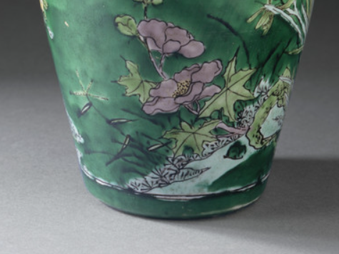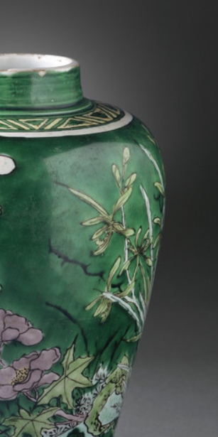 本品高度为17.46 厘米。造型为典型的小口、短颈、丰肩、敛腹,古朴端庄 。通体施绿釉为地,色泽浓郁沉稳,其上以素三彩工艺绘花卉图案,有粉紫花朵、黄绿枝叶、白色小花等,色彩搭配和谐,纹饰细腻生动,展现出花卉的自然姿态。颈部饰几何纹,增添装饰层次。