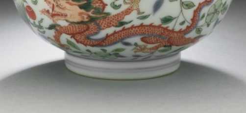 本品高度6.35厘米,直径12.7厘米。造型规整,敞口深腹、圈足小巧,尽显端庄。以五彩工艺绘饰,外壁红彩巨龙穿梭于绿彩花卉间,龙身矫健、鳞片分明,花卉枝叶舒展,辅以蓝、黄等色点缀,色彩绚丽和谐。