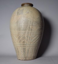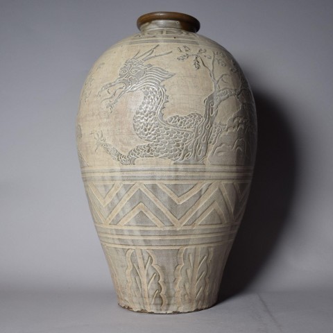 瓶高49.5厘米,卵圆形,短直颈,突唇,平底。浅黄色陶器采用厚厚的巧克力棕色釉料和透明中性釉,上面覆盖着一层不透明的灰色薄膜。该装饰品是通过切掉棕色纸片并留下轻微浮雕的设计而形成的。两侧是岩石和树木,还有两条龙在争辩着轻微的浮雕。两侧有岩石、树木和两条龙争云中的珍珠。上下有坚硬的叶子和人字形图案带,由朴素的环隔开。底座未上釉。