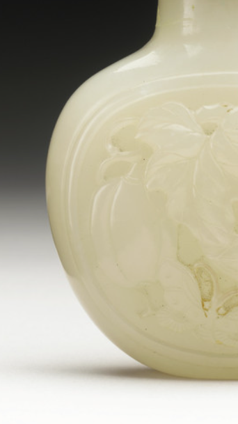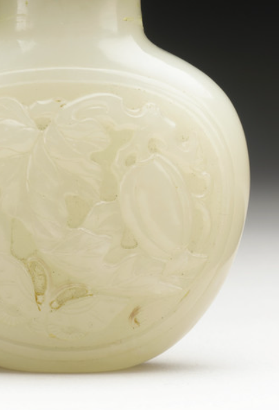 本品规格为整体7 x 5.08 x 3.18 厘米,盖子1.59 x 1.59 厘米,瓶子5.72 x 5.08 x 3.18 厘米。壶身采用浅浮雕工艺,在玉面雕琢瓜果、枝叶纹饰 —— 瓜果饱满圆润,叶片脉络清晰,线条流畅自然,似随风轻摆。浮雕深度仅数毫米,却能通过 “高低起伏” 呈现立体感,既保留玉面的光滑质感,又让纹饰 “浮于玉上”,体现清代玉雕 “以简胜繁、含蓄典雅” 的审美。