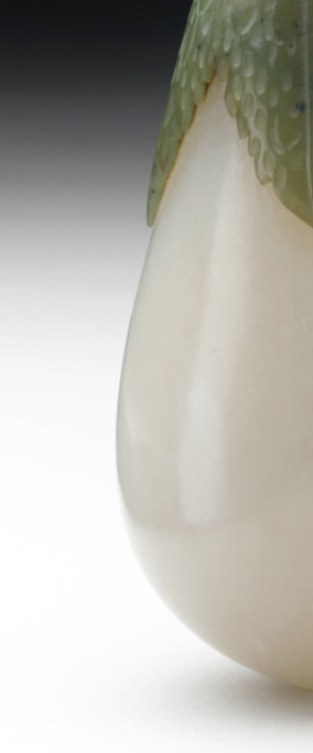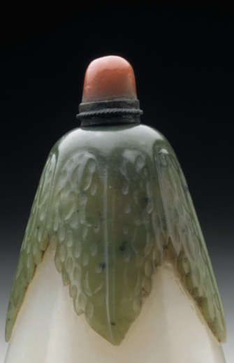 本品规格为整体8.89 x 4.13 厘米,盖子6.03 x .95 厘米,瓶子7.62 x 4.13 厘米。鼻烟壶整体为茄子仿生型—— 白玉雕成 “茄身”(圆润饱满,略带自然弯曲,模拟茄子的形态),青玉雕成 “茄蒂”(叶脉清晰,边缘微卷,如刚摘下的新鲜茄子),红玛瑙雕成 “茄柄盖钮”(小巧逼真,与茄蒂衔接自然)。这种 “以假乱真” 的仿生设计,是清代 “生活化题材” 在玉雕中的体现(将日常蔬果,化为文玩雅器)。