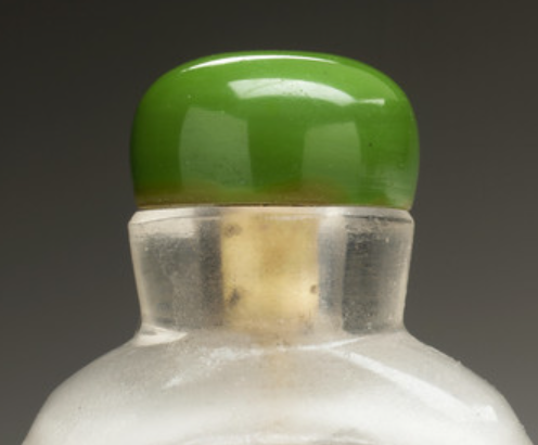 本品高度为7厘米,宽度3.5厘米。主体为磨砂玻璃(表面经磨砂处理,呈现朦胧半透明质感,为内画创作提供 “天然画布” ),顶部配绿色琉璃盖(仿翡翠色,起密封、装饰作用 ),壶口内有金属匙(原配取烟工具,已部分氧化 ),体现鼻烟壶 “实用 + 装饰” 的双重属性。