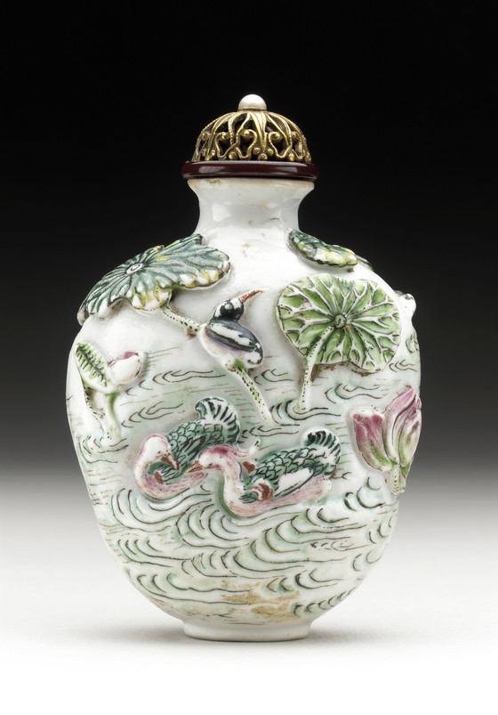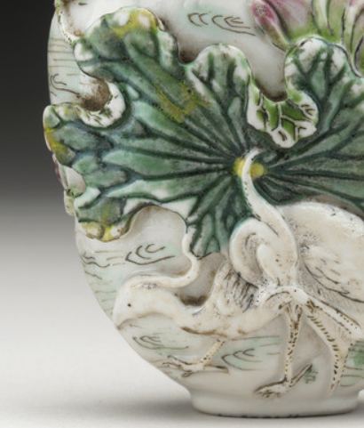 瓷胎堆塑加彩荷塘鹭鸶纹鼻烟壶