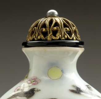 清代社会盛行吉祥文化,人们追求幸福、吉祥、富贵的生活,希望通过各种方式表达美好的愿望。花鸟纹中的许多元素都具有吉祥寓意,如梅花象征坚韧和高洁,喜鹊寓意喜庆和吉祥,牡丹代表富贵等。将这些花鸟组合绘制在鼻烟壶上,既满足了人们对美好生活的向往,也让鼻烟壶更具文化内涵和情感价值。