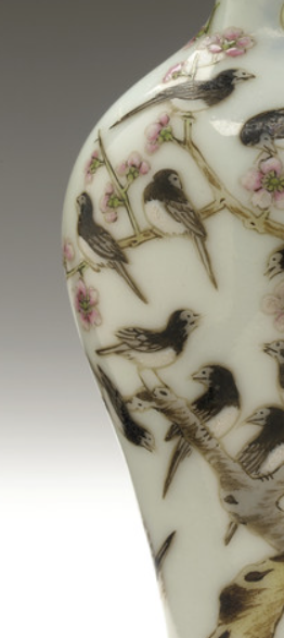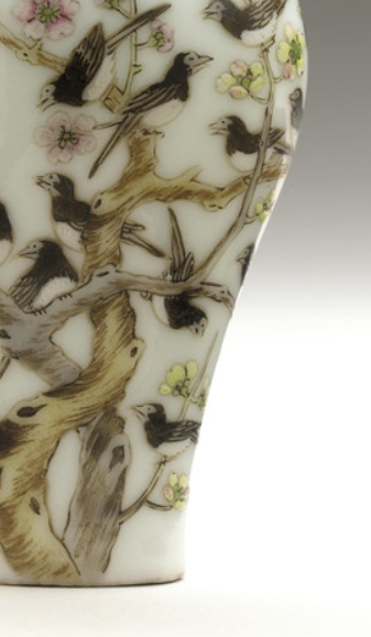 本品规格为8.57 x 5.08 x 3.18 厘米。瓷质胎体细腻坚致,施白釉温润莹亮,如凝脂般匀净。瓶身呈修长梅瓶型,线条流畅,肩窄腹丰,底足小巧,比例协调,便于手持把玩 。以粉彩绘花鸟图景 —— 梅枝曲折伸展,花朵粉白娇柔,或绽或含;黑羽鸟儿姿态各异,或栖息枝头、或振翅欲飞,生动鲜活。色彩搭配和谐,白粉花朵、墨色禽鸟与浅褐枝干相互映衬,细腻笔触勾勒出花瓣纹理、鸟羽层次,尽显 “工笔花鸟” 韵味,契合清代粉彩 “精致写实” 的风格 。
