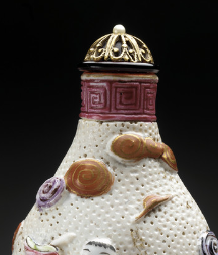 本品高度为8.6厘米,宽度4.4厘米。壶身堆塑“鹿角仙人”形象(人物头顶鹿角,衣饰华丽,手持法器),周围环绕五彩云纹(红、紫、金、蓝等色,螺旋状造型,似祥云涌动)。“鹿角仙人” 是清代 “神话杂糅” 题材(融合道教 “仙人” 与民间 “瑞兽” 元素),借奇幻形象传递 “超凡脱俗、祥瑞降临” 的寓意,区别于传统 “写实人物”,更显神秘浪漫。