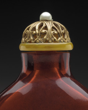 本品规格为整体7.3 x 5.08 x 2.54 厘米,盖子6.35 x 1.92 厘米,瓶子5.72 x 5.4 x 2.54 厘米。为清代最流行的扁圆壶型(小口、短颈、鼓腹),符合 “鼻烟壶需便携、贴合掌心” 的实用需求。器型比例精准(颈腹过渡自然,腹部饱满却不臃肿),无多余装饰,以 “纯粹几何线条” 展现 “大道至简” 的审美。壶盖为鎏金镂空盖(金色主体,雕刻卷草纹)+珍珠钮(顶部嵌小珍珠,增添华贵感),与琥珀色玻璃形成 “金、珠、玻璃” 的材质对比。