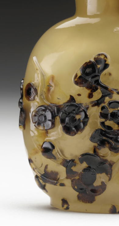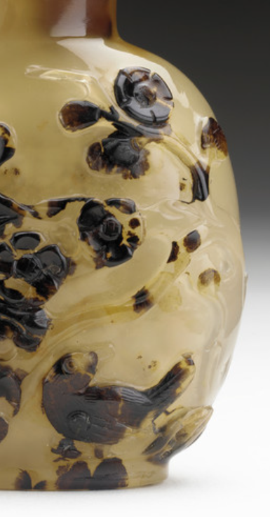 在清代,嗅闻鼻烟成为了一种社交礼仪和风尚。贵族、官员、文人雅士们常常聚在一起,互相交换鼻烟,品评鼻烟的品质和鼻烟壶的精美程度。玛瑙巧雕花鸟纹鼻烟壶因其精美的工艺和珍贵的材质,成为了人们在社交场合中展示身份和品味的重要物品, 可以拉近彼此的距离,促进交流和友谊。
