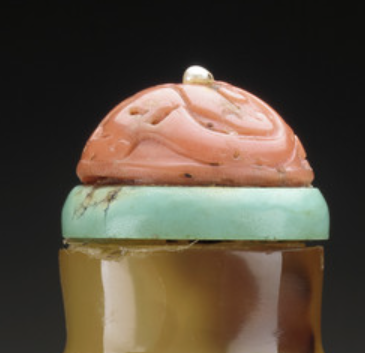 文物描述:本品规格为整体7 x 4.76 x 2.86 厘米,盖子6.35 x 2.22 厘米,瓶子5.4 x 4.76 x 2.86 厘米。以玛瑙为主体(底色呈淡黄色,天然纹理与深色矿斑完美融合),顶部配有珊瑚盖(粉红色,雕刻简化云纹)与绿松石隔层(浅绿色,起装饰与固定作用),体现清代鼻烟壶 “一器多材、因材施艺” 的特色。