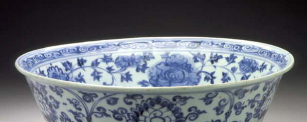 本品高度为13厘米,直径为32.7厘米。造型为敞口、弧腹、圈足,胎质细腻。碗身以青花绘缠枝莲纹,口沿、腹部图案层次分明,青花发色浓淡相宜,缠枝莲连绵缠绕,寓意吉祥。